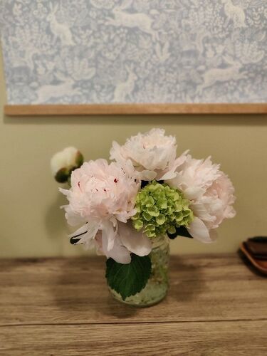 コーラルピンクの大きな芍薬も大好きだけど、淡いピンクの芍薬も可愛らしくて好きです。ふわふわピンクの芍薬と緑の紫陽花を買ってきて、家でアレンジしました。やっぱりお花屋さんで作ってもらうようにはいかないけど、近くを通ると優しいばらのような香り…