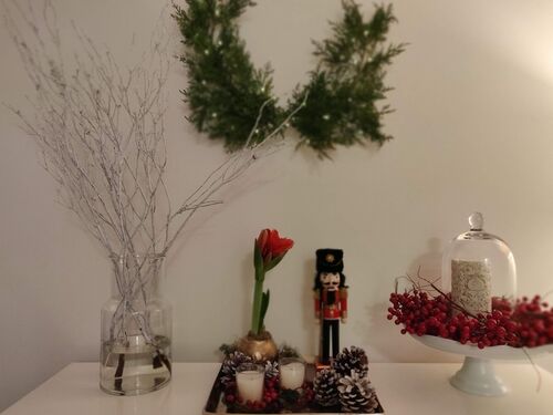 仕事のお昼休み、本日はお花屋さんで白い枝を見つけました。ローズヒップとか、クリスマスの緑、松ぼっくりなんかも一緒に飾ったら可愛いだろうなぁ。水やり不要のアマリリスも、明日には咲きそうです。 スーパーの生リース売り場。こちらも素敵だったなぁ。…