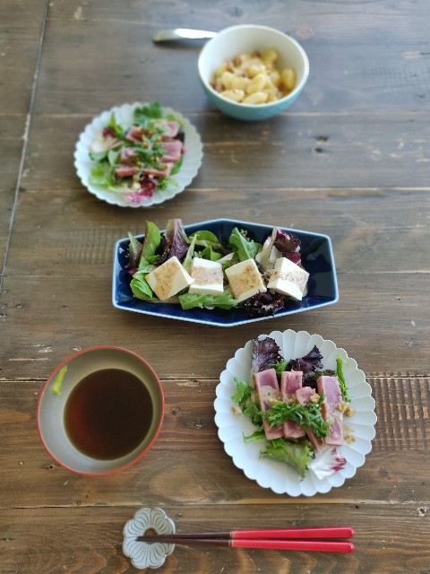 キハダマグロは塩、こしょうを振って、オリーブオイルとにんにくで全面を焼きました。ミールキットの残りのサラダリーフとくるみ、しそ、金のごまだれドレッシングで。魚事体に味はなかったけど…タレで食べた感じ。夫は昨日のニョッキの残り、私は一把だけ残っていたお素麺と冷奴をごまだれで。お素麺もしそマジックで、とても美味しかったです。