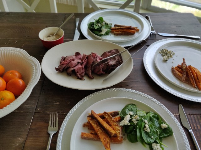 お芋を縦に切って、(拍子木切りというのか?)オリーブオイル、塩、コショウ、スパイスを少し(今回は家にあったカレー粉とクミンを使いました)とパン粉で和えてオーブンで焼きます。400F(180℃ぐらいかな?)で20分―25分ぐらい。ステーキのソースも美味しくて、こちらもローストビーフ用にリピート。我が家は↓の作り方で、最近はフライパンで表面を焼いてからそのままオーブンで焼くスタイル。お肉には塩、こしょう、ガーリック(手抜きでチューブの物)、モントリオールステーキスパイスを揉みこんでから。ソースは、玉ねぎをお肉と一緒にフライパンで炒めて取り出しておき、ローストビーフが出来上がったら取り出して、そのフライパンに玉ねぎを戻し、白ワインを煮詰める。塩、黒コショウ、サワークリームを混ぜて完成!
